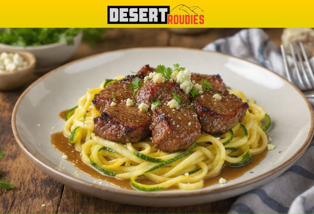 1. Garlic Butter Steak Bites with Zucchini Noodles & Blue Cheese Crumbles